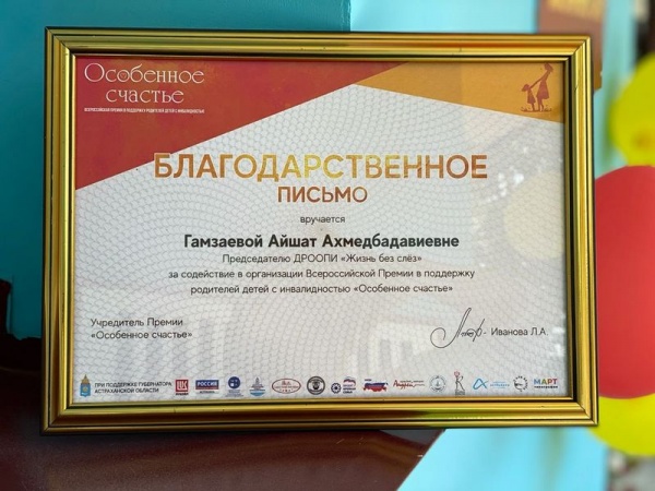 Организаторы Премии "Особенное счастье" отметили Благодарственным письмом и работу председателя ДРООПИ "Жизнь без слез" Айшат Гамзаевой.