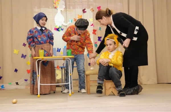 В праздничном представлении особенно яркими и интересными были инсценировки в исполнении детей по популярным детским произведениям и сказкам. Это - "Курочка Ряба", "Чиполлино", "Терем-теремок", "Буратино". Юные артисты очень старались хорошо исполнить свою роль, ведь в зрительном зале сидели их мамы и папы, которым они посвящали свои выступления.