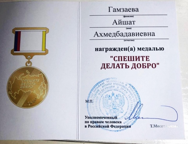Эту медаль получили 10 человек. Среди них был наш руководитель ДРООПИ «Жизнь без слез» Гамзаева Айшат Ахмедбадавиевна.